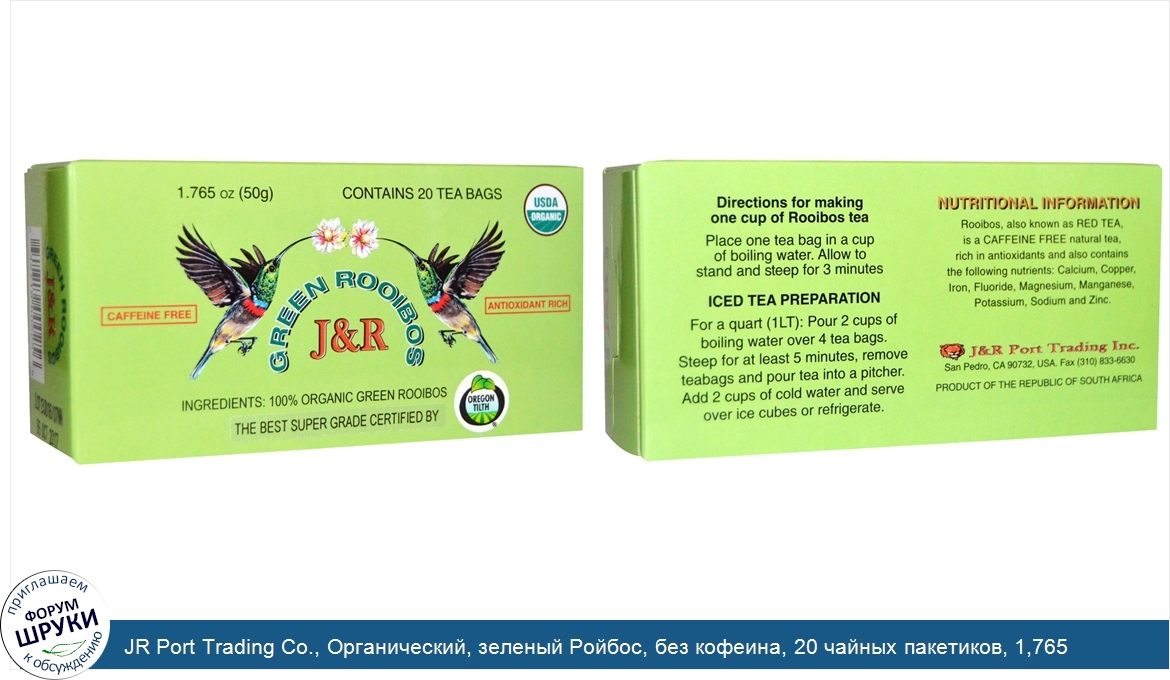 Друзья, если у вас есть отзыв/дополнение/комментарий/вопрос относительно JR Port Trading Co., Органический, зеленый Ройбос, без кофеина, 20 чайных пакетиков, 1,765 унции (50 г) - напишите его ответом в эту тему (это будет полезно всему сообществу в целом и вам в отдельности).
