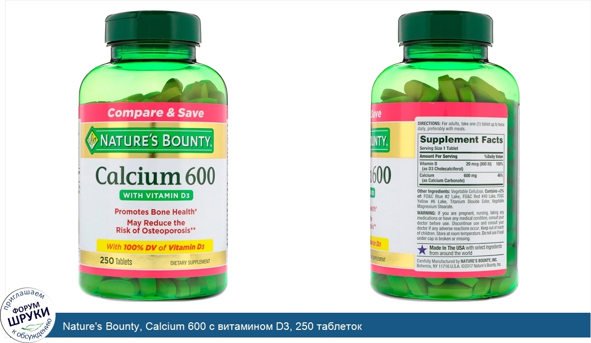 Друзья, если у вас есть отзыв/дополнение/комментарий/вопрос относительно Nature's Bounty, Calcium 600 с витамином D3, 250 таблеток - напишите его ответом в эту тему (это будет полезно всему сообществу в целом и вам в отдельности).