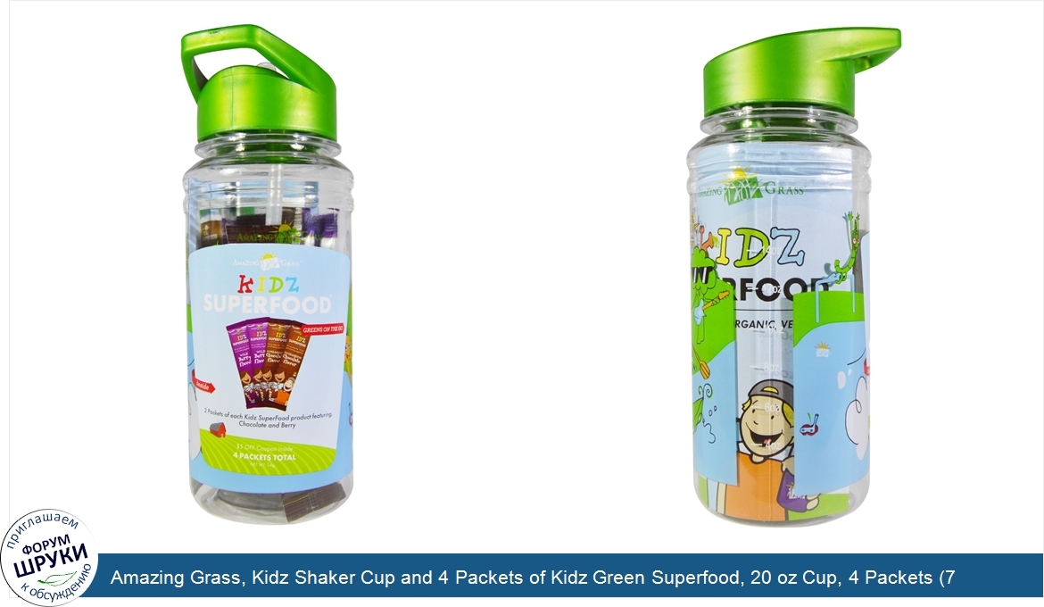 ru Amazing Grass, Kidz Shaker Cup and 4 Packets of Kidz Green Superfood, 20 oz Cup, 4 Packets (7 g) Each