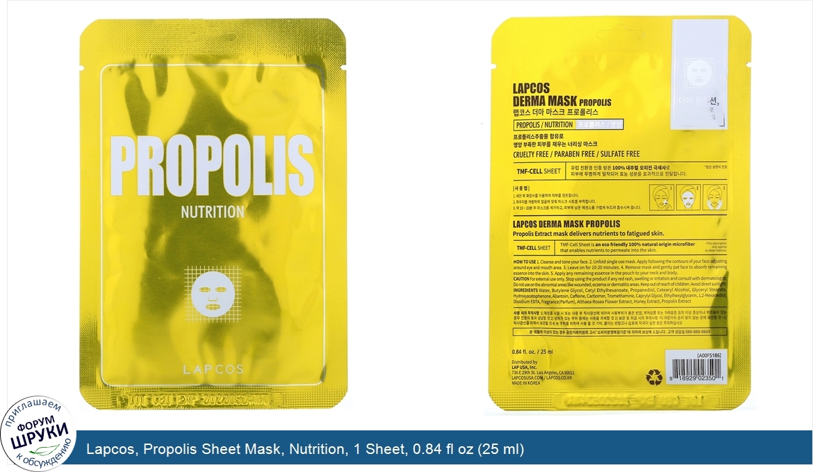Друзья, если у вас есть отзыв/дополнение/комментарий/вопрос относительно Lapcos, Propolis Sheet Mask, Nutrition, 1 Sheet, 0.84 fl oz (25 ml) - напишите его ответом в эту тему (это будет полезно всему сообществу в целом и вам в отдельности).