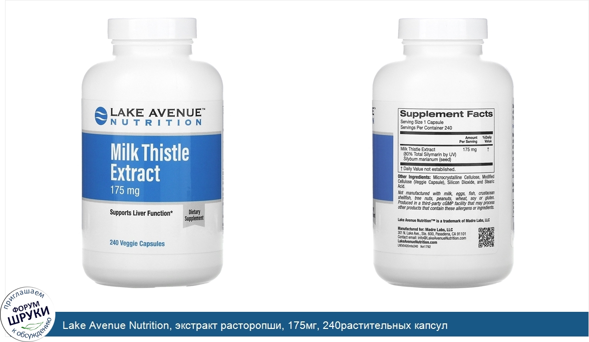 Друзья, если у вас есть отзыв/дополнение/комментарий/вопрос относительно Lake Avenue Nutrition, экстракт расторопши, 175мг, 240растительных капсул - напишите его ответом в эту тему (это будет полезно всему сообществу в целом и вам в отдельности).