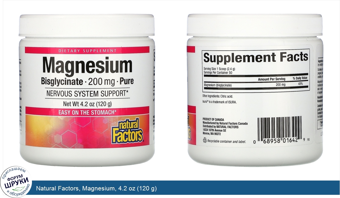 Друзья, если у вас есть отзыв/дополнение/комментарий/вопрос относительно Natural Factors, Magnesium, 4.2 oz (120 g) - напишите его ответом в эту тему (это будет полезно всему сообществу в целом и вам в отдельности).