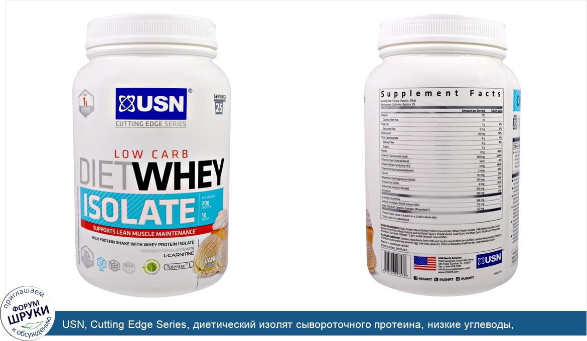 [DESCRIPT]Only 1 g Sugar Per Serving. 25 Servings. Dietary Supplement. Supports Lean Muscle Maintenance. High Protein Shake with Whey Protein Isolate. Advanced Formulation with L-Carnitine. 20 g Protein Per Serving. 31 Daily. Phytofare. Tolerase L. Natural and Artificial Flavor. Benefits:. Protein contributes to the maintenance of lean muscle. Vitamin D contributes to maintenance of normal bones and muscle function. Vitamin C maintains the normal function of the immune system, and contributes to the reduction of tiredness and fatigue. Calcium supports normal energy-yielding metabolism and normal function of digestive enzymes. It is also needed for the maintenance of normal bones and teeth. Vitamin B6 supports normal protein and glycogen metabolism, normal function of the immune system, and regulation of hormonal activity. Vitamin B12 contributes to the reduction of tiredness and fatigue; it also contributes to normal function of the immune system. Magnesium contributes to a reduction of tiredness and fatigue. It is also needed for normal energy yielding metabolism, as well as normal functioning of the nervous system and muscles. Zinc contributes to protection of cells from oxidative stress. Contains tolerase L (pH-stable lactase). Lactase enzyme improves lactose digestion in individuals who have difficulty digesting lactose. Product Information:. USN's Diet Whey Isolate represents the newest and most advanced technology in supplementing a weight management and lean muscle maintenance plan. This delicious shake provides you with a low calorie snack, high in protein with only 4 g of carbohydrate per serving. USN Diet Whey Isolate is easy to prepare and contains a combination of Garcinia Cambogia, Green Tea (leaf) Catechin Complex (Phytofare), L-Carnitine, Vitamin D, Vitamin C, Calcium, Magnesium and Zinc to help support weight control, muscle health, performance and maintenance.[/DESCRIPT]... (описание дополняется)