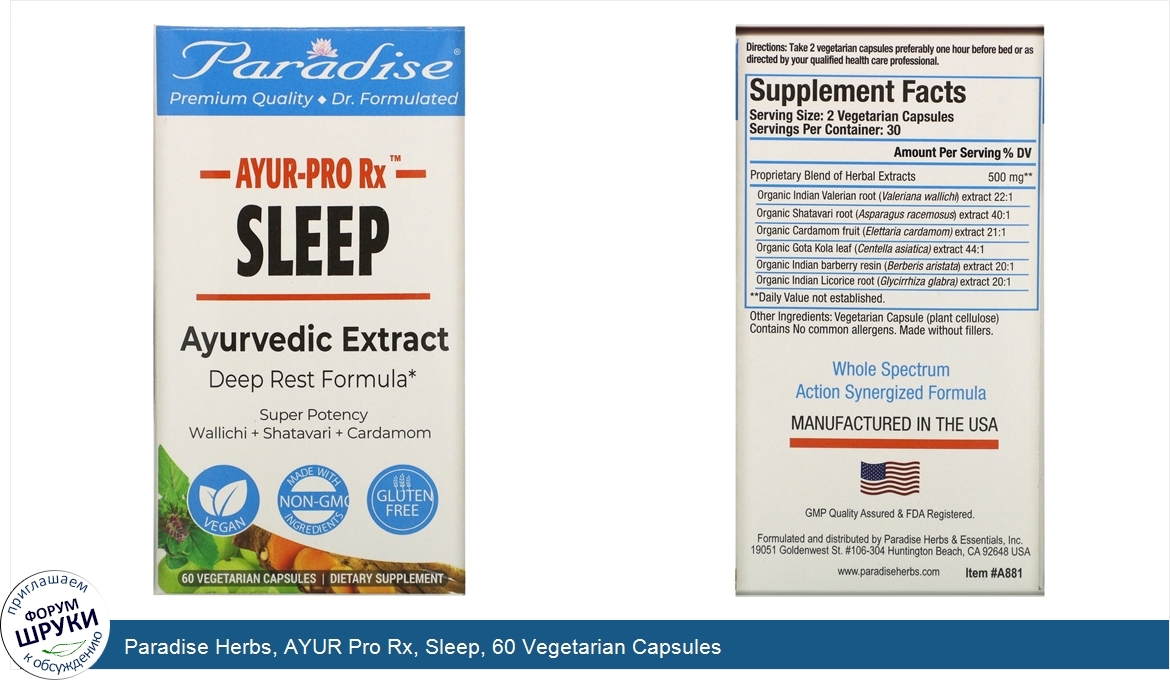 [DESCRIPT]Over 25 Years of Excellence. Premium Quality - Dr. Formulated. Ayurvedic Extract. Deep Rest Formula. Super Potency. Wallichi + Shatavari + Cardamom. Vegan. Made with Non-GMO Ingredients. Gluten Free. Dietary Supplement. Whole Spectrum Action Synergized Formula. GMP Quality Assured FDA Registered. Enhancing Nature's Miracles Since 1994. Ayurveda - The Science of Life. Ayurveda gas been in existence for about 5,000 years. Along with Traditional Chinese herbalism is one of the oldest forms of natural medicine. Ayurveda is a complex art using a holistic approach that takes in the entire person and focuses on the root of imbalance rather than just the mere symptoms. Quality - Purity - Potency. Paradise products have won over a decade of Best of Supplements Awards. We are dedicated to sourcing premium ultra pure ingredients that meet the highest standards of excellence. No Unnecessary Fillers. Unlike tablets that contain binders, fillers, magnesium stearate for stearic acid (which may inhibit absorption), our vegetarian capsules dissolve quickly in the digestive tract. We don't add unnecessary fillers, binders, stearates, artificial colors, flavors or preservatives to our encapsulations. Ayur-Pro RX. Paradise Ayur-Pro RX products are formulated by real Ayurvedic practitioners. The focus is on clean, pure proper souring while combining these ayurvedic herbal extract for maximum synergy, efficacy, safety, purity and potency. Sleep - Deep Rest Formula. According to Ayurveda, sleep is essential to good health. Too much though and stress make it difficult to achieve a deep and restful quality of sleep. Our premium quality Ayurvedic Sleep formula contains super potent extracts of Wallichi and Shatavari bring you the most active and nurturing Paradise Sleep formula available.[/DESCRIPT]... (описание дополняется)