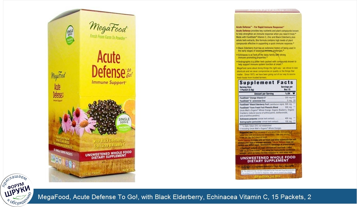 ru MegaFood, Acute Defense To Go!, with Black Elderberry, Echinacea Vitamin C, 15 Packets, 2.6 g Each