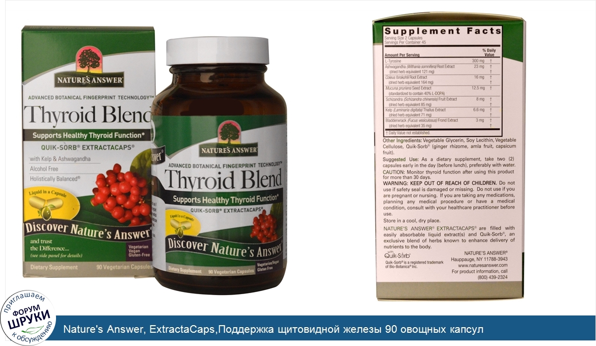 [DESCRIPT]Discover Nature's Answer and Trust the Difference. Since 1972. Advanced Botanical Fingerprint Technology. Supports Healthy Thyroid Function. Quik-Sorb Extractacaps. With Kelp Ashwagandha. Alcohol Free. Holistically Balanced. Liquid in a Capsule. Vegetarian. Vegan. Gluten-Free. Dietary Supplement. With Quik-Sorb. Nature's Answer ExtractaCaps. are filled with easily absorbable liquid extract(s) and Quik-Sorb, an exclusive blend of herbs known to enhance delivery of nutrients to the body. Advanced Botanical Fingerprint Technology. The Genius of Mother Nature In Every Bottle - Just as She Intended. "The true value of a plant lies deep within its natural holistic balance.". Frank D'Amelia, Sr., Founder, Nature's Answer. With one of the most comprehensive herbariums in the world, Nature's Answer has identified Mother Nature's Advanced Botanical Fingerprint Technology for over 800 unique plant reference standards. These authenticated samples serve as the standard by which all incoming raw material is judged. Using carefully-controlled extraction techniques, we capture the holistic balance of each herb and the value is passed on to you, the consumer, who can be assured that the product in your hand is authentic, safe, effective, holistically balanced, and of course. Nature's Answer. The True Nature of Our Standards go way beyond the herb. A trusted, ethical, family-owned and operated business since 1972. Our facility is FDA Registered, NSF GMP Certified, organic and kosher certified. Over 100 quality control checkpoints in every bottle. Vertically Integrated: Allows for the highest quality at the best possible price. Proudly Made in the USA. Responsibly and with Love.[/DESCRIPT]... (описание дополняется)