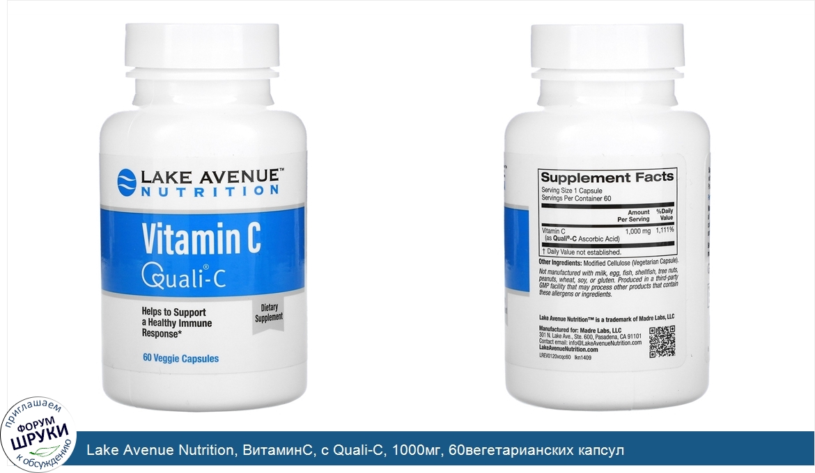 Lake Avenue Nutrition, ВитаминC, с Quali-C, 1000мг, 60вегетарианских капсул