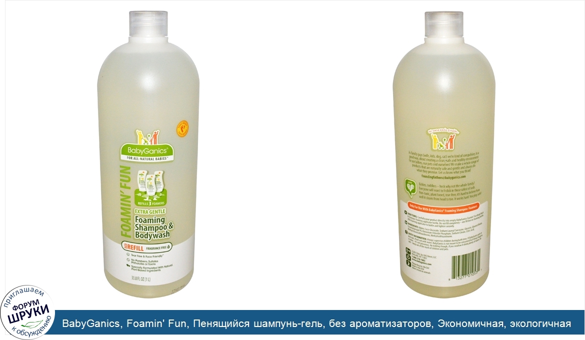 ru BabyGanics, Foamin' Fun, Пенящийся шампунь-гель, без ароматизаторов, Экономичная, экологичная упаковка, 33,8 жидких унций (1 л)