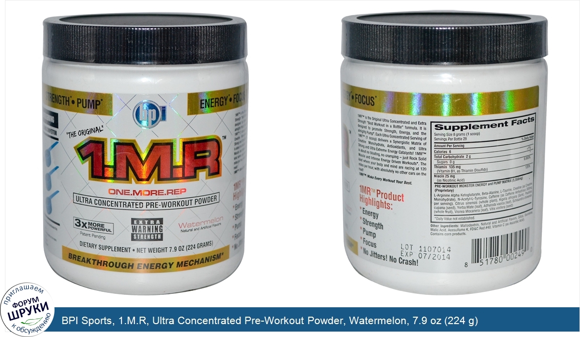 Друзья, если у вас есть отзыв/дополнение/комментарий/вопрос относительно BPI Sports, 1.M.R, Ultra Concentrated Pre-Workout Powder, Watermelon, 7.9 oz (224 g) - напишите его ответом в эту тему (это будет полезно всему сообществу в целом и вам в отдельности).