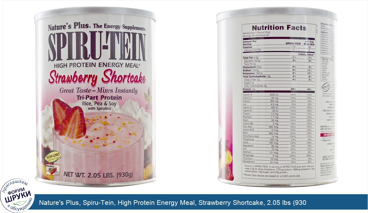 [DESCRIPT]The Energy Supplements. 25 Years Spiru-Tein. One Taste is all it Takes! . High Protein Energy Meal*. Great Taste - Mixes Instantly. Tri ~ Part Protein. Tri-Part Protein - Rice, Pea Soy with Spirulina. Non-GMO. Natural Soy. Healthy Heart Food. Vegetarian, Yeast-Free Product. Non GMO Natural Soy. -Spiru-Tein is scientifically formulated with isolated soy protein from only non-genetically modified (non-GMO) soybeans — As Nature Intended. 25 grams of soy protein a day, as part of a diet low in saturated fat and cholesterol, may reduce the risk of heart disease. A serving of Spiru-Tein supplies 6.25 grams of soy protein. Nature's Plus Strawberry Shortcake Spiru-Tein Powder features a unique blend of ingredients, including. Superior Tri-Part Protein Blend: Rice, Pea, Soy. 100% Daily Value of all Vitamins. Broad Profile of Essential Minerals. Energy Nutrients: High Quality Tri-Part Protein and Bee Pollen. Diet-Aids: Lecithin, Spirulina, Choline and Inositol. Enzymes: Bromelain and Papaya. Cleansing: Chlorophyll. Fiber: Bran, Cellulose and Apple Pectin. *Not to be used as the sole source of dietary calories.[/DESCRIPT]... (описание дополняется)