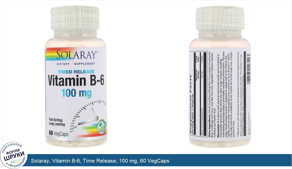 Друзья, если у вас есть отзыв/дополнение/комментарий/вопрос относительно Solaray, Vitamin B-6, Time Release, 100 mg, 60 VegCaps - напишите его ответом в эту тему (это будет полезно всему сообществу в целом и вам в отдельности).