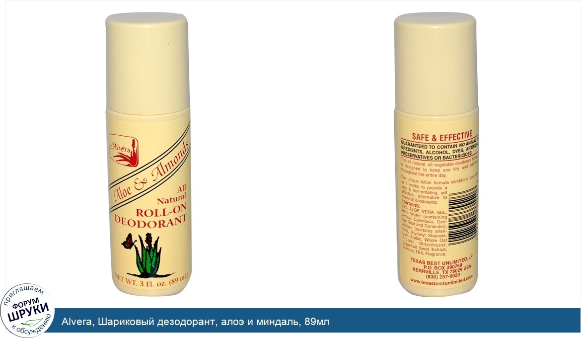 Alvera, Шариковый дезодорант, алоэ и миндаль, 89мл