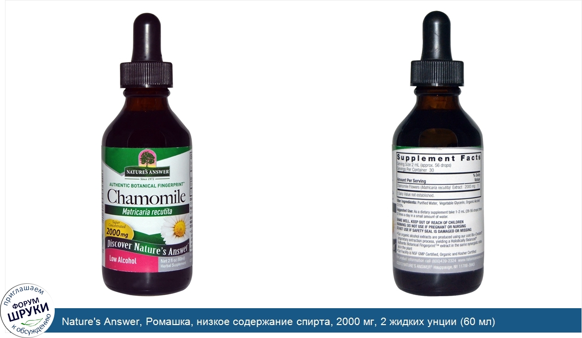Друзья, если у вас есть отзыв/дополнение/комментарий/вопрос относительно Nature's Answer, Ромашка, низкое содержание спирта, 2000 мг, 2 жидких унции (60 мл) - напишите его ответом в эту тему (это будет полезно всему сообществу в целом и вам в отдельности).