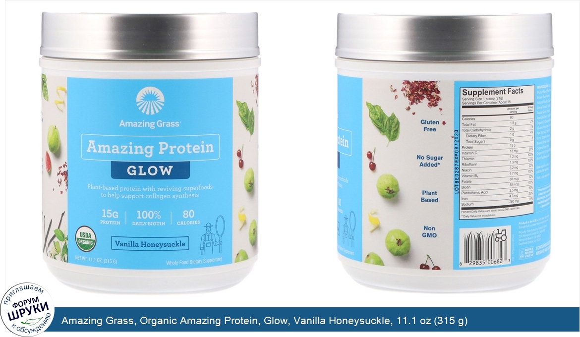 Amazing Grass, Organic Amazing Protein, Glow, Vanilla Honeysuckle, 11.1 oz (315 g)