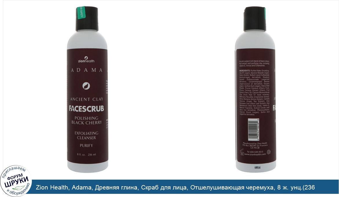 Zion Health, Adama, Древняя глина, Скраб для лица, Отшелушивающая черемуха, 8 ж. унц.(236 мл)