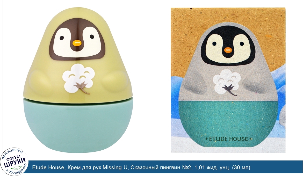 Друзья, если у вас есть отзыв/дополнение/комментарий/вопрос относительно Etude House, Крем для рук Missing U, Сказочный пингвин №2, 1,01 жид. унц. (30 мл) - напишите его ответом в эту тему (это будет полезно всему сообществу в целом и вам в отдельности).