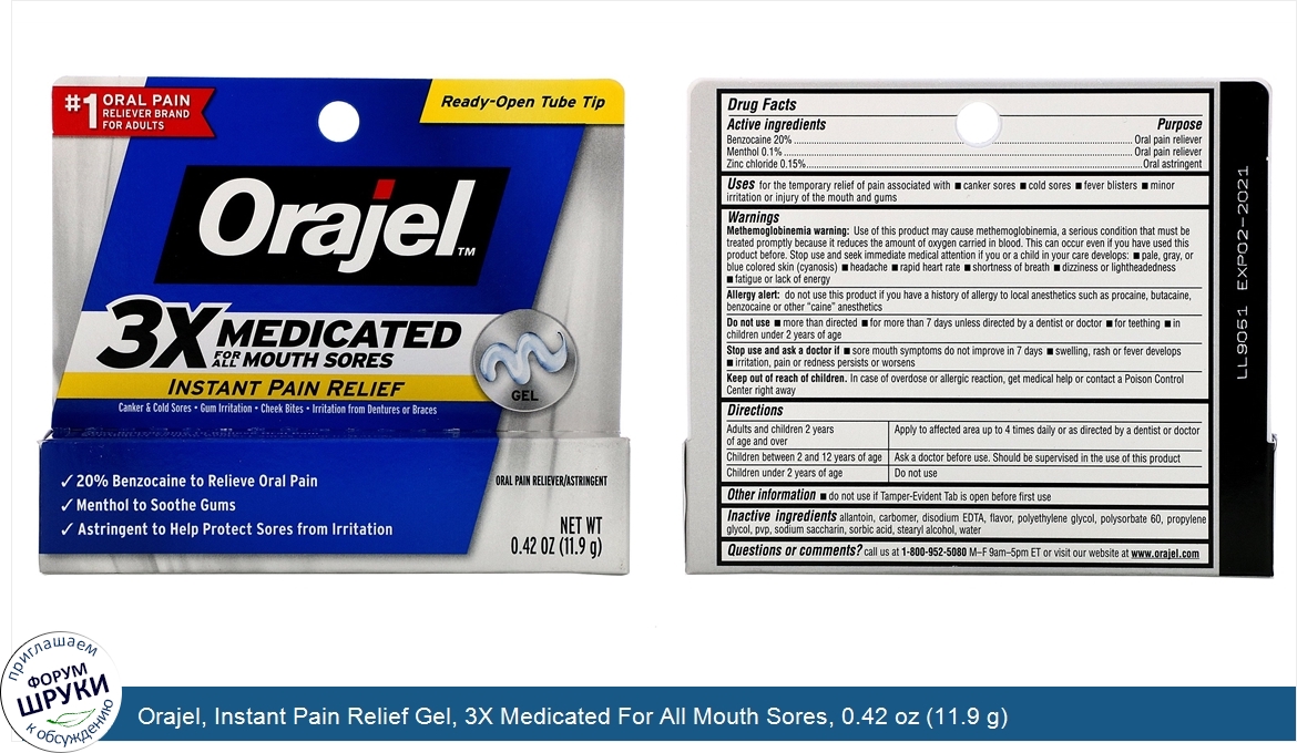 Друзья, если у вас есть отзыв/дополнение/комментарий/вопрос относительно Orajel, Instant Pain Relief Gel, 3X Medicated For All Mouth Sores, 0.42 oz (11.9 g) - напишите его ответом в эту тему (это будет полезно всему сообществу в целом и вам в отдельности).