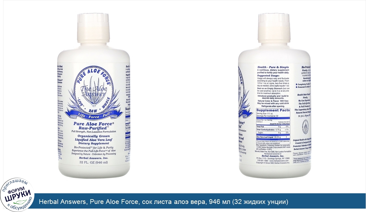 Herbal Answers, Pure Aloe Force, сок листа алоэ вера, 946 мл (32 жидких унции)