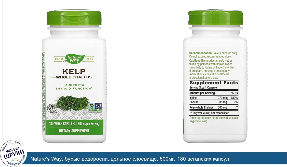 [DESCRIPT]Компания основана в 1969 году. Поддерживает функцию щитовидной железы. Сертификат Certified Authentic TRU-ID™. Сертификат Non GMO Project Verified. 600 мг в 1 порции. Пищевая добавка. Веганский продукт. Поддерживает функцию щитовидной железы. Бурые водоросли растут под водой и являются отличным источником йода. Nature's Way® использует водоросли, полученные без нанесения вреда окружающей среде из холодных водоемов, таких как в Новой Шотландии, где собиратели диких растений аккуратно срезают листья, не выкорчевывая растения, чтобы дать им возможность отрасти в будущем. Сотрудники Nature's Way® уверены, что только природа способна дать нам все самое лучшее. Именно поэтому мы отбираем самые качественные травы, которые только есть на земле. Таким образом мы обеспечиваем бескомпромиссное качество и помогаем вам вести здоровый образ жизни.[/DESCRIPT]... (описание дополняется)