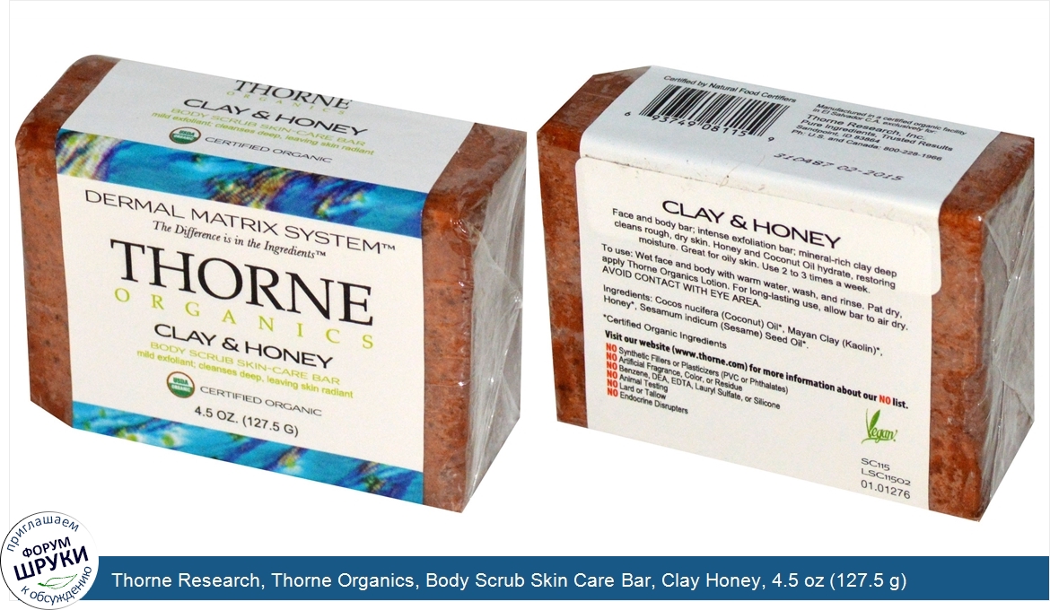 Друзья, если у вас есть отзыв/дополнение/комментарий/вопрос относительно Thorne Research, Thorne Organics, Body Scrub Skin Care Bar, Clay Honey, 4.5 oz (127.5 g) - напишите его ответом в эту тему (это будет полезно всему сообществу в целом и вам в отдельности).