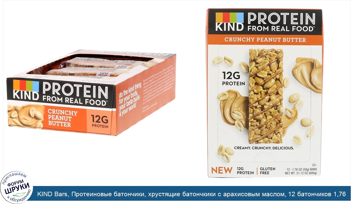 KIND Bars, Протеиновые батончики, хрустящие батончкики с арахисовым маслом, 12 батончиков 1,76 унц. (50 г) каждая