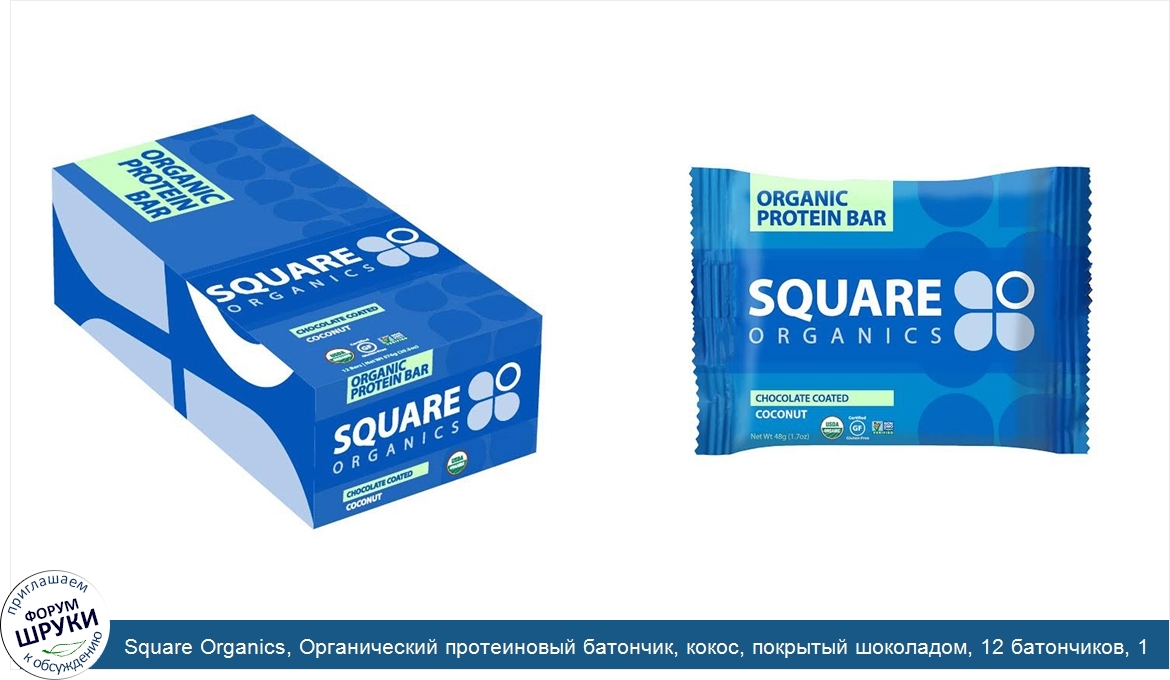 Square Organics, Органический протеиновый батончик, кокос, покрытый шоколадом, 12 батончиков, 1,7 унции (48 г) каждый