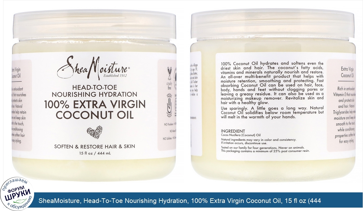 [DESCRIPT]Established 1912. Soften Restore Hair Skin. Cruelty Free. Family Founded Operated. Ethically Traded - Sustainably Produced. Certified B Corporation. No Parabens - No Phthalates. No Mineral Oil. No Sulfate - No Animal Testing. Our Story. Sofi Tucker started selling Shea Nut at the village market in Bonthe, Sierra Leone in 1912. By age 19, the widowed mother of four was selling Shea Butter, African Black Soap and her homemade hair and skin preparations all over the countryside. Sofi Tucker was our Grandmother and SheaMoisture is her legacy. Through Community Commerce you help empower, disadvantaged women to realize a brighter, healthier future. 100% Coconut Oil hydrates and softens even the driest skin and hair. The coconut's fatty acids, vitamins and minerals naturally nourish and restore. An all-over multi-benefit product that helps with moisture retention, smoothing and protecting. Fast absorbing coconut oil can be used on hair, face, body, hands and feet without clogging pores or leaving a greasy residue. It can also be used as a moisturizing makeup remover. Revitalize skin and hair with a healthy glow. Extra Virgin Coconut Oil. Rich in antioxidant Vitamin E that nourishes and protects skin and Hair. Natural triglycerides help retain moisture and keep skin smooth to the touch, while conditioning properties soften hair for easy styling. Tested on our family for four generations. Never on animals.[/DESCRIPT]... (описание дополняется)