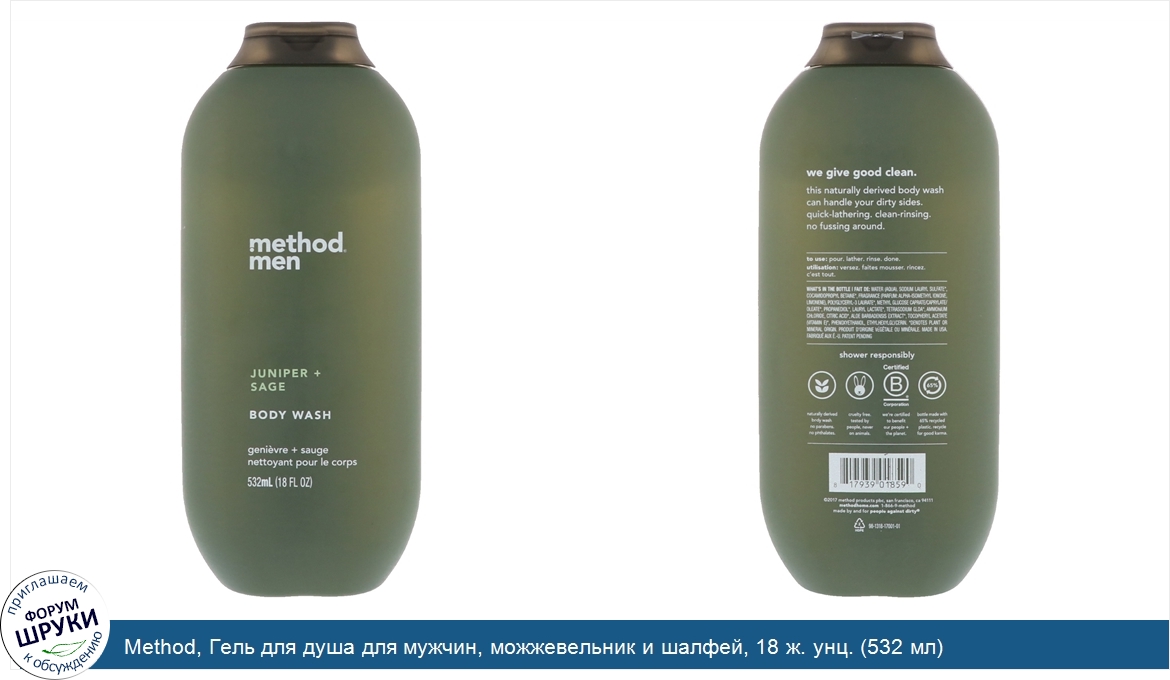 Друзья, если у вас есть отзыв/дополнение/комментарий/вопрос относительно Method, Гель для душа для мужчин, можжевельник и шалфей, 18 ж. унц. (532 мл) - напишите его ответом в эту тему (это будет полезно всему сообществу в целом и вам в отдельности).