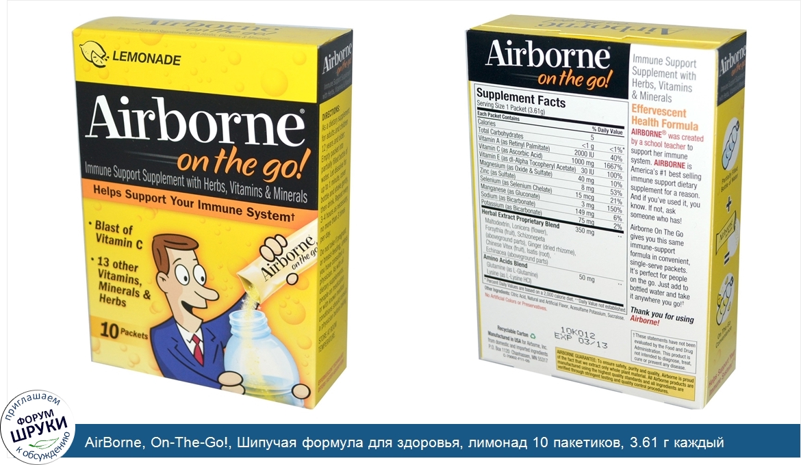 Друзья, если у вас есть отзыв/дополнение/комментарий/вопрос относительно AirBorne, On-The-Go!, Шипучая формула для здоровья, лимонад 10 пакетиков, 3.61 г каждый - напишите его ответом в эту тему (это будет полезно всему сообществу в целом и вам в отдельности).