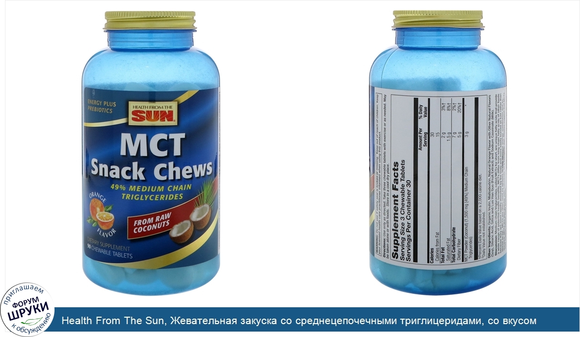 Друзья, если у вас есть отзыв/дополнение/комментарий/вопрос относительно Health From The Sun, Жевательная закуска со среднецепочечными триглицеридами, со вкусом апельсина, 90 жевательных таблеток - напишите его ответом в эту тему (это будет полезно всему сообществу в целом и вам в отдельности).