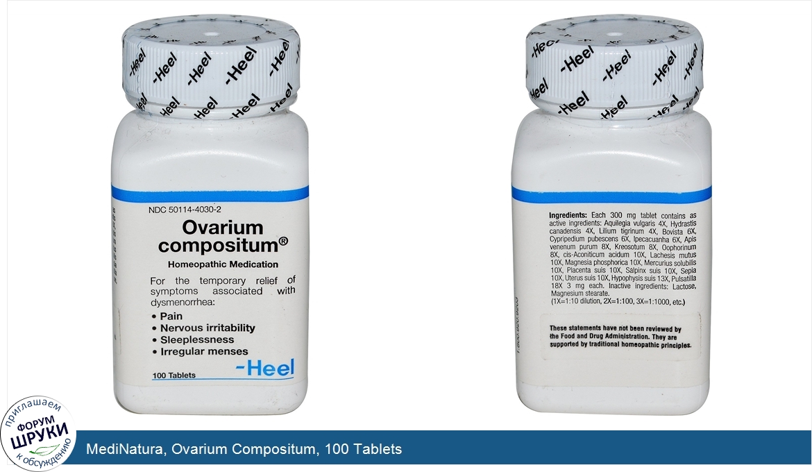 Друзья, если у вас есть отзыв/дополнение/комментарий/вопрос относительно MediNatura, Ovarium Compositum, 100 Tablets - напишите его ответом в эту тему (это будет полезно всему сообществу в целом и вам в отдельности).