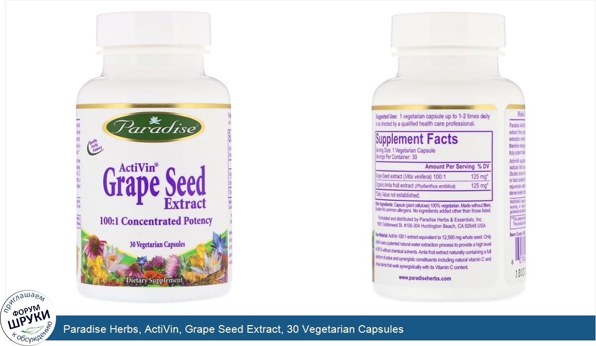 [DESCRIPT]Quality, Purity, Potency. 100:1 Concentrated Potency. Dietary Supplement. Enhancing Nature's Miracles Since 1994. Made The Way Nature Intended! Paradise ActiVin® Grape Seed Extract is a 100:1 potent holistic extract from premier California grapes. Using a 100% natural extraction method the true essence of the whole herb is captured, therefore retaining all of its active and synergistic constituents in a truly potent holistic full spectrum form the way nature intended. Activin® supports against environmental and stress-related free radicals that can cause premature aging and cellular damage. Studies show it to be a far greater antioxidant than vitamin E, C or beta carotene. Our unique formula contains Amla fruit extract, a rejuvenator used in ayurvedic medicine and known for its nutrient dense levels of naturally occurring vitamin C.[/DESCRIPT]... (описание дополняется)