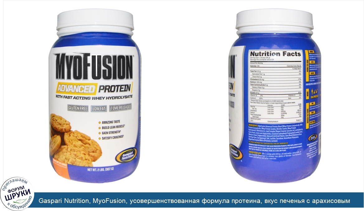 ru Gaspari Nutrition, MyoFusion, усовершенствованная формула протеина, вкус печенья с арахисовым маслом, 2 фунта (907 г)