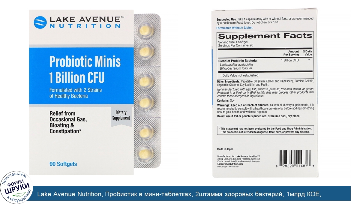 Произведено в Японии. Пробиотик в мини-таблетках. Lake Avenue Nutrition. Смесь 2 штаммов, 1 млрд КОЕ. Средство от эпизодического метеоризма, вздутия и запора*. Доступно в запечатанных фольгой блистерных упаковках...
