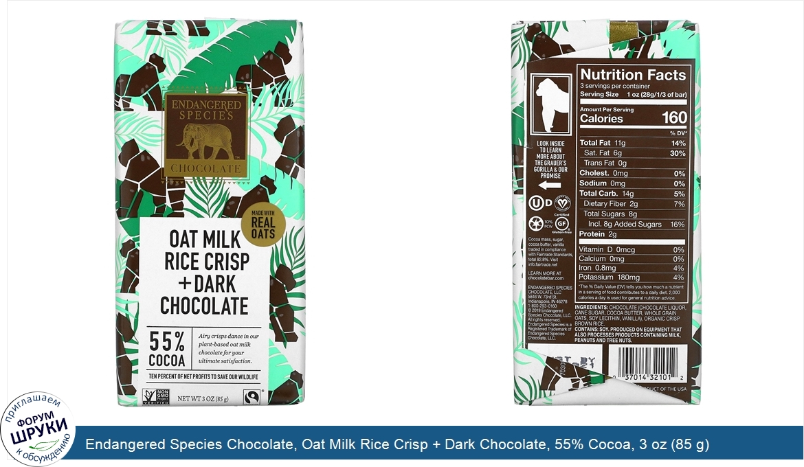 Друзья, если у вас есть отзыв/дополнение/комментарий/вопрос относительно Endangered Species Chocolate, Oat Milk Rice Crisp + Dark Chocolate, 55% Cocoa, 3 oz (85 g) - напишите его ответом в эту тему (это будет полезно всему сообществу в целом и вам в отдельности).