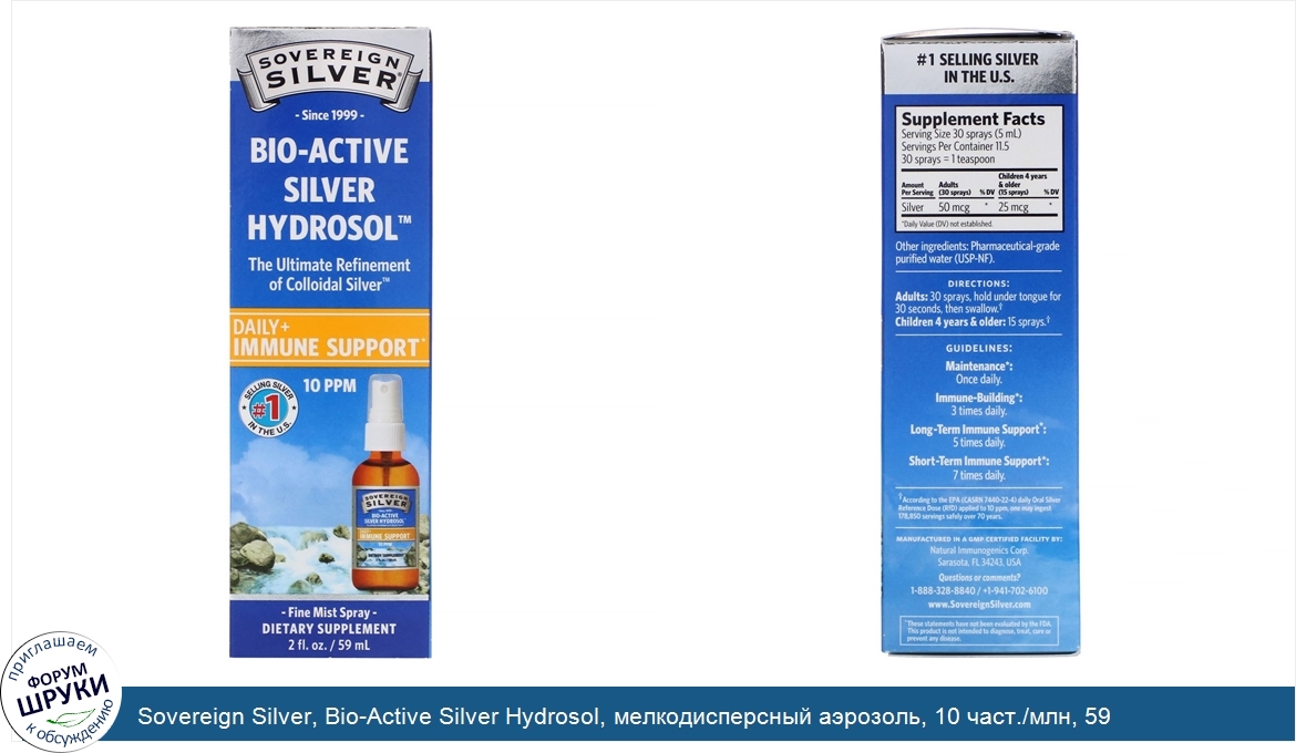 [DESCRIPT]Компания основана в 1999 году. The Ultimate Refinement of Colloidal Silver™ (максимально чистый препарат коллоидного серебра). Ежедневная иммунная поддержка. Лидер по продаже продуктов с серебром в США. Мелкодисперсный аэрозоль. Пищевая добавка. Производится предприятием, соответствующим требованиям надлежащей производственной практики (GMP). Не содержит ГМО — сертификат NSF™. Веганский продукт. Не содержит глютена. Почему серебро используют для поддержки иммунной системы? Серебро использовалось более 2400 лет для защиты здоровья человека. Это природный элемент, который находится в зерне, съедобных и лекарственных грибах, женском грудном молоке, родниковой, морской и водопроводной воде. Со времен Гиппократа свойства серебра защищать здоровье были хорошо известны и широко использовались. Серебро использовалось для защиты чистоты и безопасности питьевой воды во всех древних цивилизациях. Не знаете, что лучше? 10, 50, 250 или 500 мкг/мл? Производители некоторых продуктов с более высокой концентрацией (мкг/мл) серебра заявляют, что одна чайная ложка их продукта равна нескольким чайным ложкам нашего продукта с концентрацией 10 мкг/мл. Однако, статьи в авторитетных научных журналах свидетельствуют о том, что серебро полезно только в том случае, когда оно имеет положительный заряд (биоактивно). Средство Bio-Active Silver Hydrosol с биоактивностью более 98% в 8 раз более эффективно, чем коллоидное серебро с концентрацией 250 мкг/мл. Более высокая концентрация также увеличивает риск токсичности. Просто нет смысла использовать более высокую концентрацию. С 1999 года в средстве Bio-Active Silver Hydrosol от Sovereign Silver используется коллоидное серебро высочайшей степени очистки, и мы гордимся тем, что оно является лидером продаж коллоидного серебра в США с 2005 года. «Наша технология позволяет получать мельчайшие частицы, которые когда-либо существовали, с почти идеальной дисперсией. и абсолютно безопасной концентрацией, действие которой превосходит продукты с гораздо более высокой концентрацией,» — считает Стивен Л. Квинто, основатель компании. В чем преимущества Bio-Active Silver Hydrosol? Безопасный. Благодаря своему крошечному размеру частицы имеют большую площадь поверхности и более высокую эффективность, что делает наш продукт с концентрацией 10 мкг/мл более эффективным, чем продукты конкурентов, содержащие до 500 мкг/мл серебра. Даже если вы будете принимать его 7 раз в день на протяжении 70 лет, вы все равно не превысите суточную пероральную безопасную референтную дозу (RfD) серебра, установленную EPA (Агентством по охране окружающей среды).†. Чистый. Sovereign Silver содержит только два ингредиента: серебро чистоты 99,999% и очищенную воду фармацевтической чистоты. Он не содержит добавленных солей или белков, которые снижают эффективность других продуктов с серебром. Кроме того, его упаковывают в стойкие к выщелачиванию флаконы из стекла, а не из пластика. Эффективный. Если серебро не заряжено положительно, оно не является биологически эффективным. Чем меньше размер частиц, тем выше биологическая активность серебра и легче организму их поглощать и выводить. У серебра Sovereign Silver беспрецедентный размер частиц, составляющий всего 0,8 нанометра, в результате чего продукт содержит более 98% биологически активных ионов серебра и нанокластеров серебра, что делает его в разы более эффективным, чем продукты други