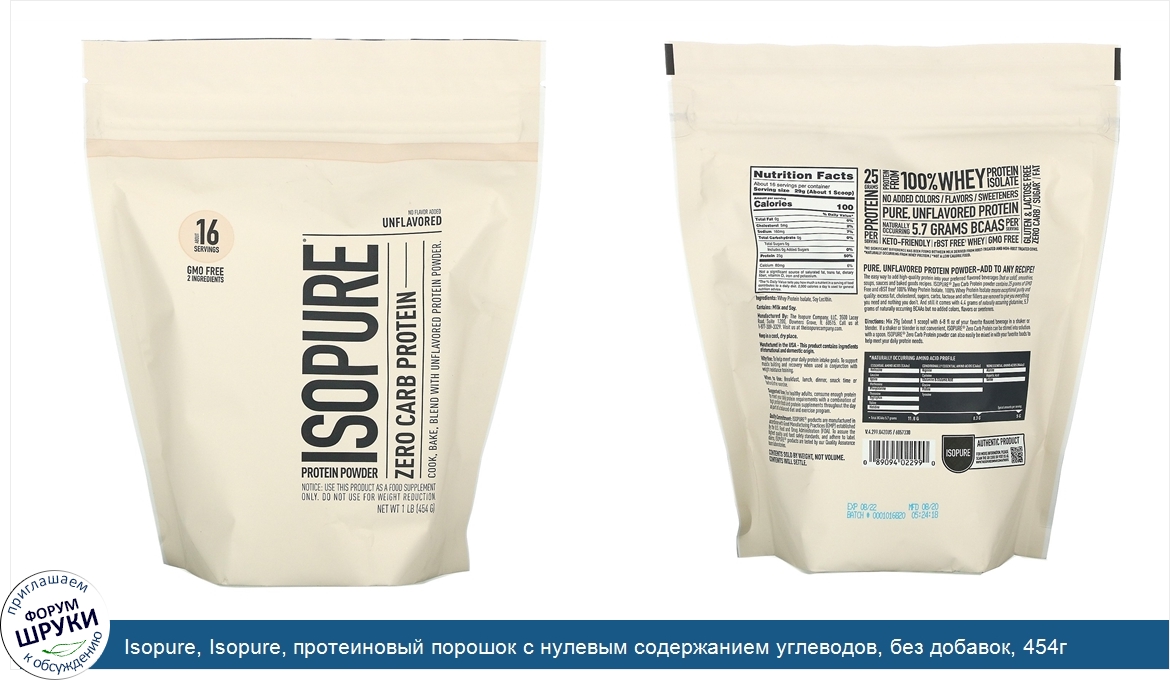 Isopure, Isopure, протеиновый порошок с нулевым содержанием углеводов, без добавок, 454г (1фунт)
