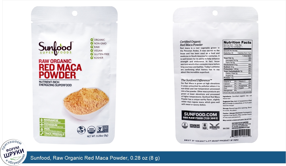 Друзья, если у вас есть отзыв/дополнение/комментарий/вопрос относительно Sunfood, Raw Organic Red Maca Powder, 0.28 oz (8 g) - напишите его ответом в эту тему (это будет полезно всему сообществу в целом и вам в отдельности).