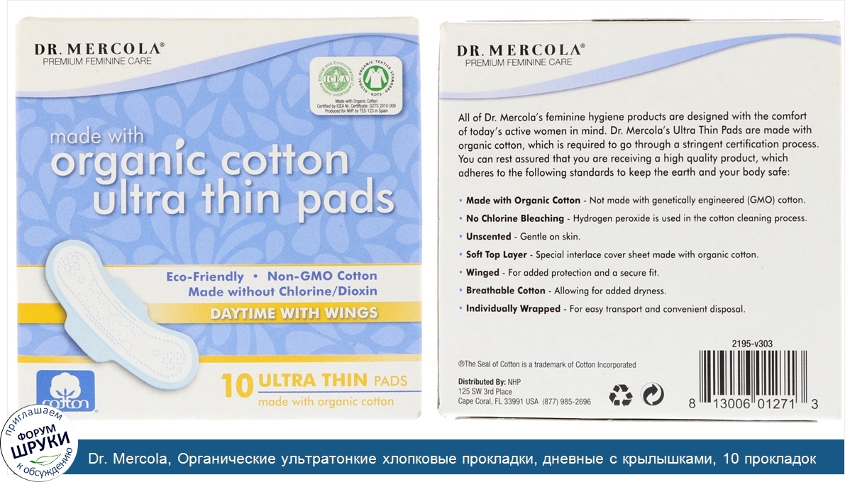 [DESCRIPT]Premium Feminine Care. ICEA - Ethical and Environmental Certification Institute. GOTS - Global Organic Textile Standard. Made with Organic Cotton Certified by ICEA Nr. Certificate: GOTS 2010-009. Produced for NHP by TES-123 in Spain. Eco Friendly. Non-GMO Cotton. Made without Chlorine/Dioxin. All of Dr. Mercola's feminine hygiene products are designed with the comfort of today's active women in mind. Dr. Mercola's Ultra Thin Pads are made with organic cotton, which is required to go through a stringent certification process. You can rest assured that you are receiving a high quality product, which adheres to the following standards to keep the earth and your body safe:. Made with Organic Cotton - Not made with genetically engineered (GMO) cotton. No Chlorine Bleaching - Hydrogen peroxide is used in the cotton cleaning process. Unscented - Gentle on the skin. Soft Top Layer - Special interlace cover sheet made with organic cotton. Winged - For added protection and a secure fit. Breathable Cotton - Allowing for added dryness. Individually Wrapped - For easy transport and convenient disposal. Dr. Mercola's Ultra Thin Pads are made to leave you feeling clean, fresh and confident. Special interlace cover sheet made with organic cotton. Leak control channels. Adhesive strip. Impermeable, leak protection back layer. Absorbent core made with organic cotton.[/DESCRIPT]... (описание дополняется)