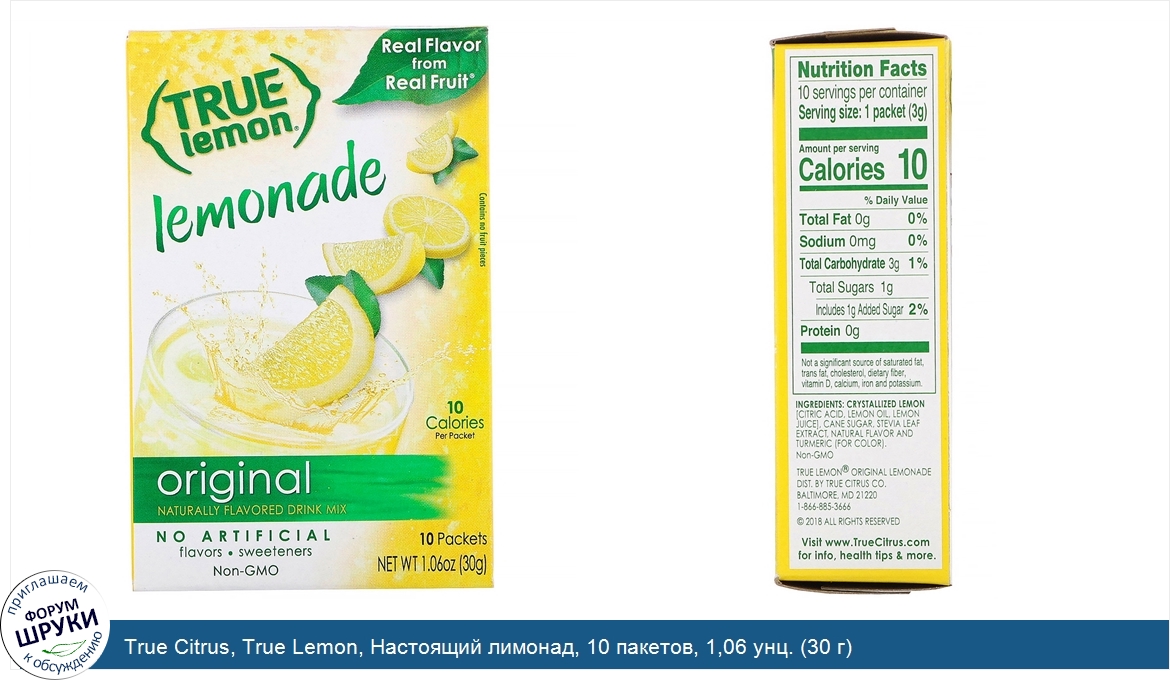 True Citrus, True Lemon, Настоящий лимонад, 10 пакетов, 1,06 унц. (30 г)