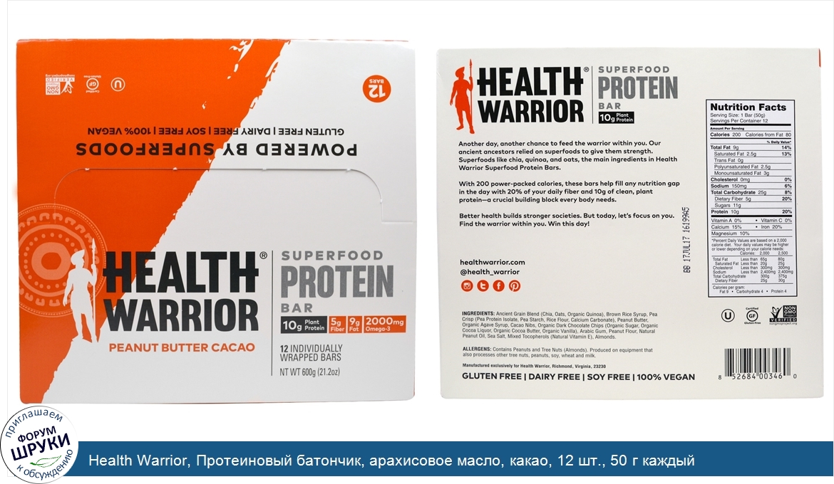 [DESCRIPT]10 g Plant Protein. 5 g Fiber. 9 g Fat. 2000 mg Omega-3. 12 Individually Wrapped Bars. Powered by Superfoods. Gluten Free. Dairy Free. Soy Free. 100% Vegan. Non GMO Project Certified. Another day, another chance to feed the warrior within you. Our ancient ancestors relied on superfoods to give them strength. Superfoods like chia, quinoa, and oats, the main ingredients in Health Warrior Superfood Protein Bars. With 200 power-packed calories, these bars help fill any nutrition gap in the day with 20% of your daily fiber and 10 g of clean, plant protein—a crucial building block every body needs. Better health builds stronger societies. But today, let's focus on you. Find the warrior within you. Win this day![/DESCRIPT]... (описание дополняется)
