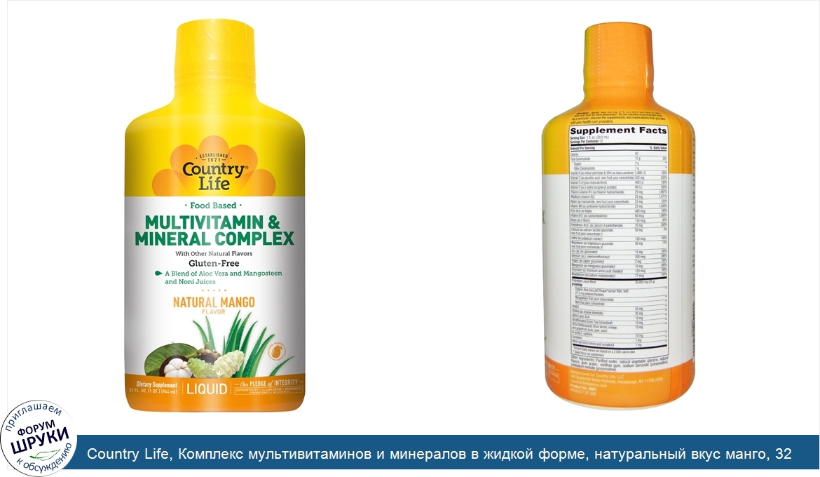 Друзья, если у вас есть отзыв/дополнение/комментарий/вопрос относительно Country Life, Комплекс мультивитаминов и минералов в жидкой форме, натуральный вкус манго, 32 жидкие унции (944 мл) - напишите его ответом в эту тему (это будет полезно всему сообществу в целом и вам в отдельности).
