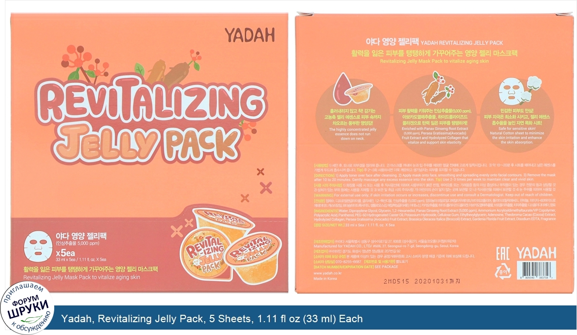 Друзья, если у вас есть отзыв/дополнение/комментарий/вопрос относительно Yadah, Revitalizing Jelly Pack, 5 Sheets, 1.11 fl oz (33 ml) Each - напишите его ответом в эту тему (это будет полезно всему сообществу в целом и вам в отдельности).