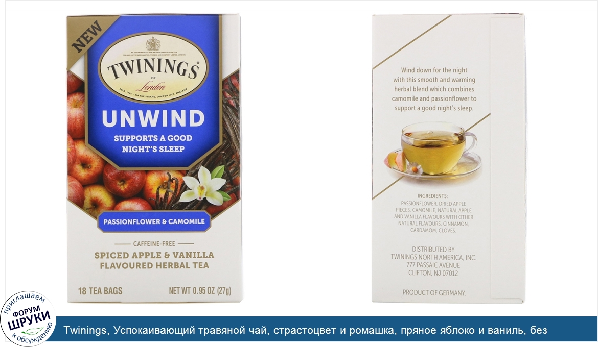 Друзья, если у вас есть отзыв/дополнение/комментарий/вопрос относительно Twinings, Успокаивающий травяной чай, страстоцвет и ромашка, пряное яблоко и ваниль, без кофеина, 18 пакетиков по 0,95 унц. (27 г) - напишите его ответом в эту тему (это будет полезно всему сообществу в целом и вам в отдельности).