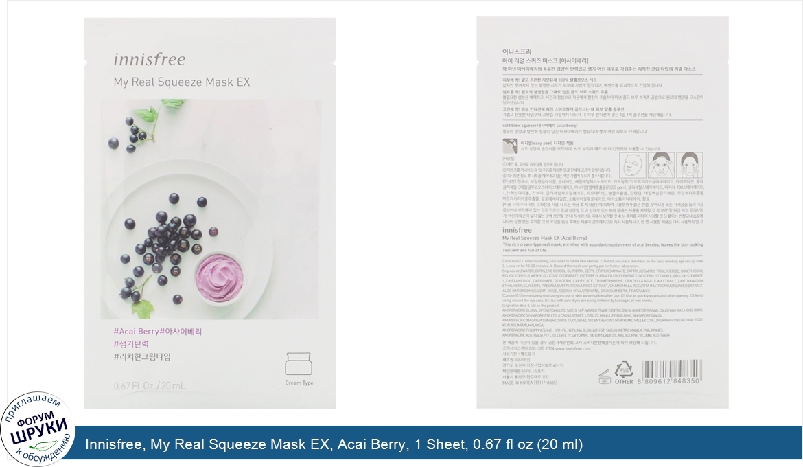 Друзья, если у вас есть отзыв/дополнение/комментарий/вопрос относительно Innisfree, My Real Squeeze Mask EX, Acai Berry, 1 Sheet, 0.67 fl oz (20 ml) - напишите его ответом в эту тему (это будет полезно всему сообществу в целом и вам в отдельности).