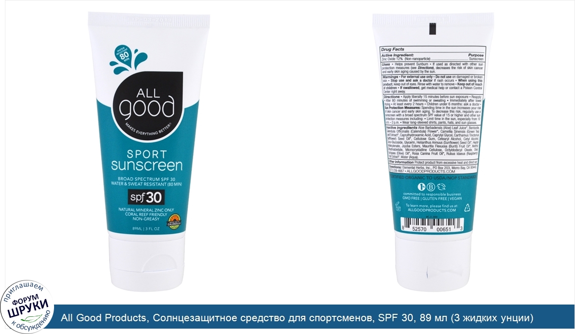 Друзья, если у вас есть отзыв/дополнение/комментарий/вопрос относительно All Good Products, Солнцезащитное средство для спортсменов, SPF 30, 89 мл (3 жидких унции) - напишите его ответом в эту тему (это будет полезно всему сообществу в целом и вам в отдельности).