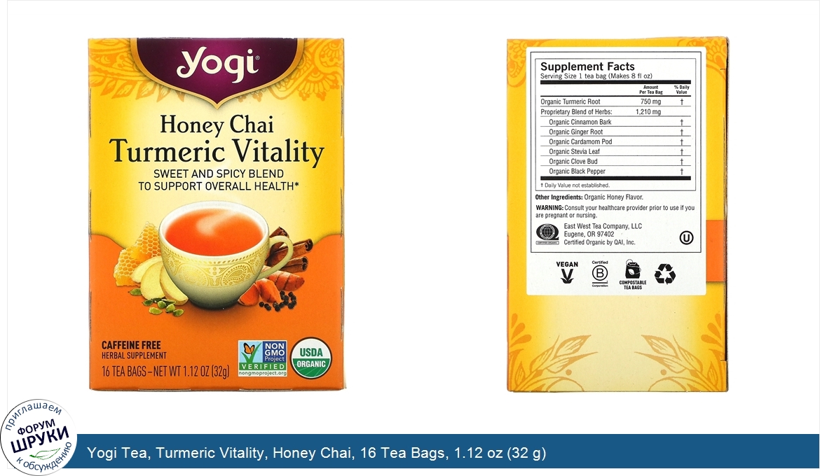 [DESCRIPT]Sweet and Spicy Blend To Support Overall Health. Caffeine Free. Herbal Supplement. Non GMO Project Verified. USDA Organic. Vegan. Certified B Corporation. Kosher. Compostable Tea Bags. Certified Organic by QAI, Inc. Support Overall Health with Honey Chai Turmeric Vitality. This intriguing chai blend begins with Turmeric, traditionally used in Ayurveda for its abundant health promoting qualities. To this we add sweet Honey flavor, and warming spices Cinnamon, Cardamom, Ginger and Clove, to deliver a rich sweet and spicy chai flavor. Enjoy Honey Chai Turmeric Vitality throughout the day to support your overall health and well-being. Yogi Principles. We blend with intention. Our flavorful teas are created to support body and mind. We believe in the synergistic benefit of herbs,. combining ingredients to enhance their wellness-supporting potential. We blend the best of what nature has to offer. using the finest spices and botanicals from around the globe.[/DESCRIPT]... (описание дополняется)