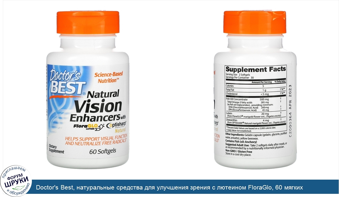[DESCRIPT]Science-Based Nutrition™. Optisharp® Zeaxanthin Natural. Helps Support Visual Function and Neutralize Free Radicals. Dietary Supplement. Non-GMO / Gluten Free. Doctor's Best Natural Vision Enhancers contains FloraGLO®. Lutein and OPTISHARP®. Natural Zeaxanthin, highly bioavailable naturally sourced carotenoids that help neutralize free radicals to support healthy visual function, macular health, and cognitive acuity. Constant exposure to ultra violet (UV) and blue light emitted from computers and mobile devices may potentially damage the retina. Omega-3 DHA and EPA help support the retina's light-sensing activity. Helps support retinal cell light-sensing capacity. Helps protect eyes from harmful high energy blue light in everyday surroundings. Helps neutralize free radicals.[/DESCRIPT]... (описание дополняется)
