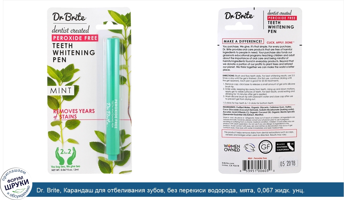 Друзья, если у вас есть отзыв/дополнение/комментарий/вопрос относительно Dr. Brite, Карандаш для отбеливания зубов, без перекиси водорода, мята, 0,067 жидк. унц. (2 мл) - напишите его ответом в эту тему (это будет полезно всему сообществу в целом и вам в отдельности).
