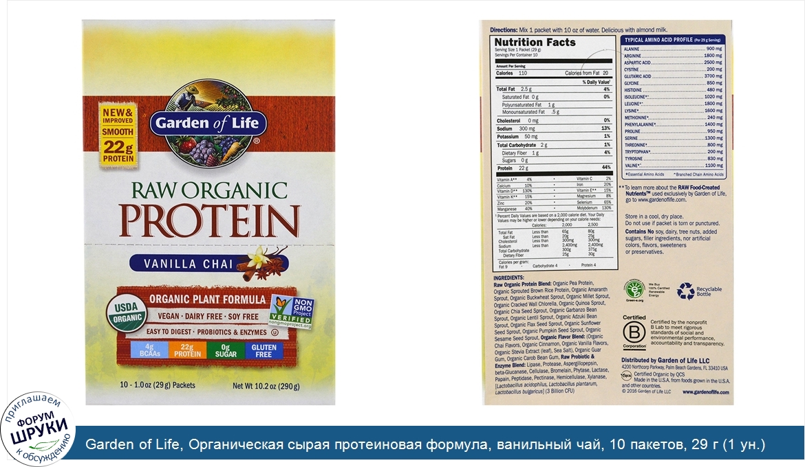 Друзья, если у вас есть отзыв/дополнение/комментарий/вопрос относительно Garden of Life, Органическая сырая протеиновая формула, ванильный чай, 10 пакетов, 29 г (1 ун.) каждый - напишите его ответом в эту тему (это будет полезно всему сообществу в целом и вам в отдельности).